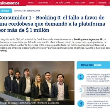 En esta nota periodistica, del diario Infonegocios, se publicó la sentencia obtenida, gracias al trabajo de los miembros del estudio, en un caso donde se favoreció a una clienta, con el amparo de la ley de defensa del consumidor, y sentó una jurisprudencia favorable. Con ello indemnizando a la persona que padeció los daños provocados por booking, y solucionando su problema.