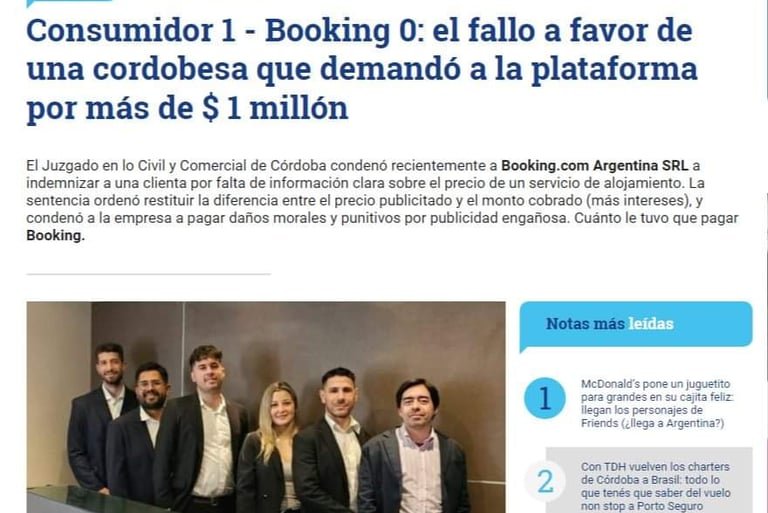 En esta nota periodistica, del diario Infonegocios, se publicó la sentencia obtenida, gracias al trabajo de los miembros del estudio, en un caso donde se favoreció a una clienta, con el amparo de la ley de defensa del consumidor, y sentó una jurisprudencia favorable. Con ello indemnizando a la persona que padeció los daños provocados por booking, y solucionando su problema.